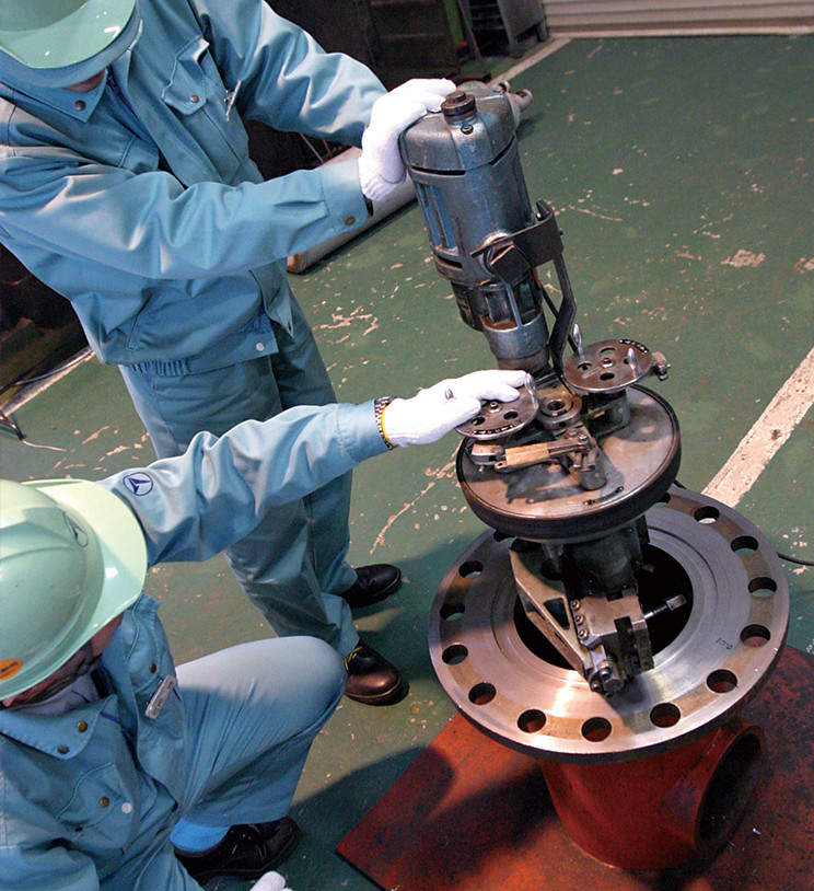 原子力発電用バルブは極めて厳しい規格・仕様に基づいて製作されており、発電所に納入後の改造工事・メンテナンスにも高い技術が要求されます。さまざまな使用条件下でそれぞれのバルブの性能が適正に維持できるよう、全部門の技術力を結集して改造工事・メンテナンスにあたります。